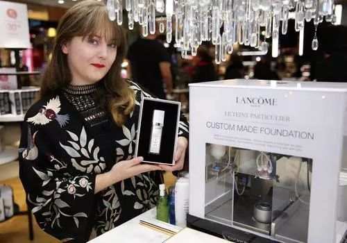 ↑在法国巴黎,一名顾客展示欧莱雅集团的美妆黑科技产品:兰蔻定制粉底液。新华社发
