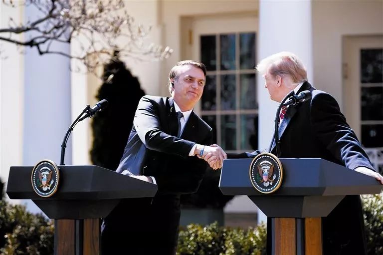 ↑今年3月份,美国总统特朗普与巴西总统博索纳罗在白宫出席联合新闻发布会。
