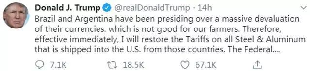 不过,最让人大跌眼镜的,是加税的理由:“阿根廷和巴西两国一直在操纵其本币汇率。”