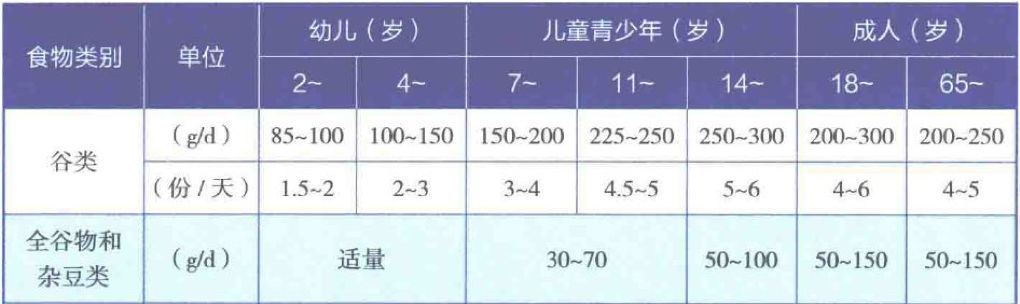 《中国居民膳食指南2016》提倡每天摄入谷薯类食物250-400克,其中50-150克全谷物及杂豆类,50-100克薯类,这个标准大致相当于主食的1/3到1/2。膳食指南建议,在轻身体活动水平下,各年龄段人群谷类每天或每周摄入量: