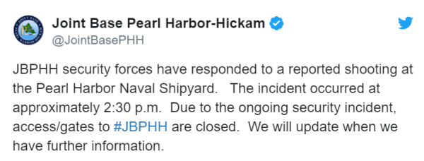 美国珍珠港枪击案进展:2位平民死亡,枪手系海军水手