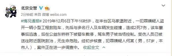 北京丰台区马家堡一男子盗开工程救险车肇事 致2死7伤