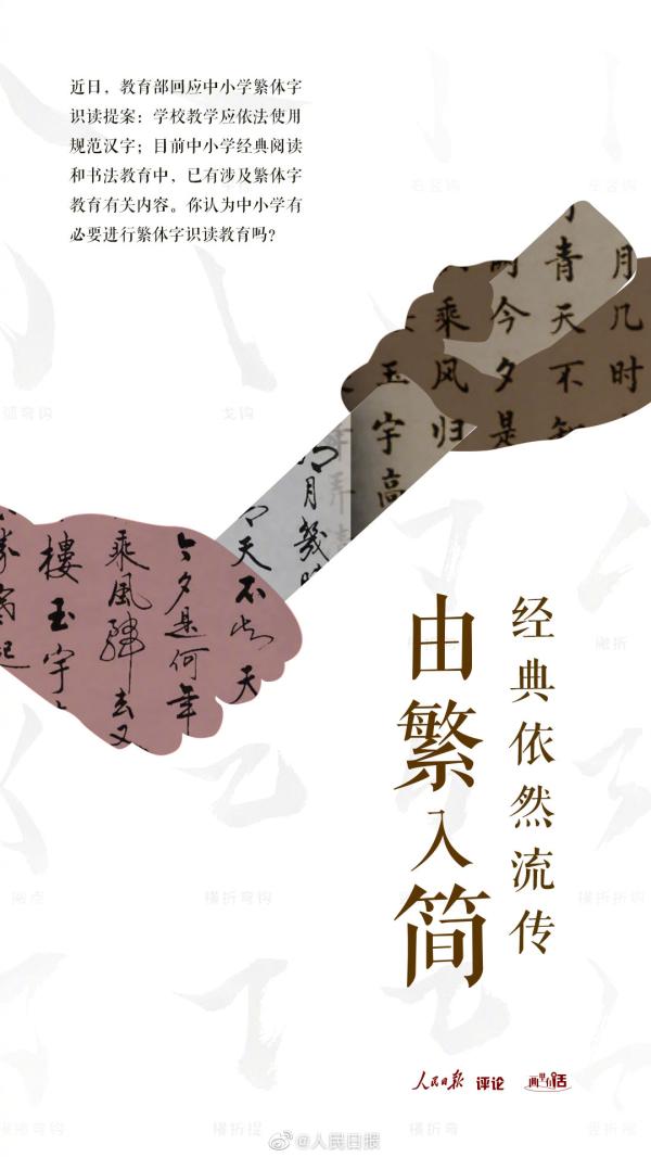 人民日报微博12月9日评论,教育部答复“在中小学教繁体字”提案:以规范汉字为基本。从龟甲上的字符始,汉字一直在流变,而文字的根本目的,还是信息传递。因为汉字简化,知识门槛曾大为降低,信息传递变得迅捷。鼓励有兴趣的孩子识读繁体,不等于弃简从繁。繁有繁之美,简有简之用。由繁入简,经典依然流传。