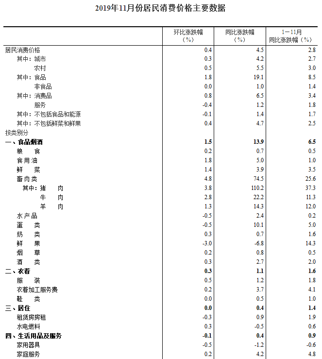 2019年11月份,全国居民消费价格同比上涨4.5%。其中,城市上涨4.2%,农村上涨5.5%;食品价格上涨19.1%,非食品价格上涨1.0%;消费品价格上涨6.5%,服务价格上涨1.2%。1—11月平均,全国居民消费价格比去年同期上涨2.8%。
