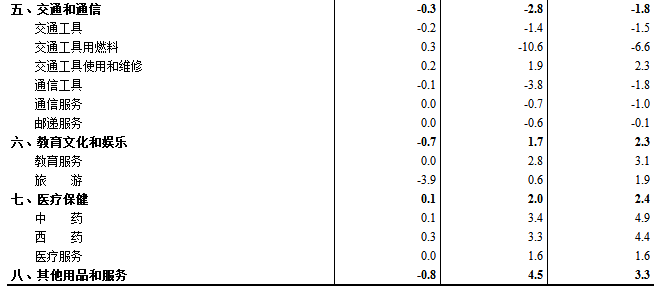 其他七大类价格同比六涨一降。其中,其他用品和服务、医疗保健、教育文化和娱乐价格分别上涨4.5%、2.0%和1.7%,衣着、居住、生活用品及服务价格分别上涨1.1%、0.4%和0.4%;交通和通信价格下降2.8%。