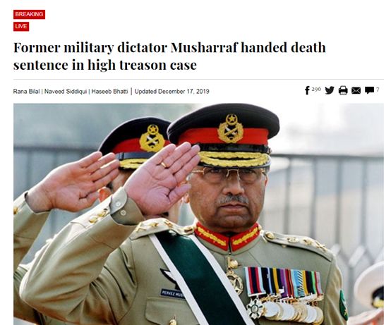 根据巴基斯坦《黎明报》的报道,判处穆沙拉夫死刑的,是巴基斯坦首都伊斯兰堡一个由三人组成的特别法庭。法庭裁决的结果是2-1,即2人支持死刑,1人反对。