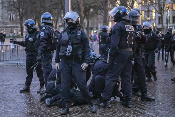 12月17日,在法国北部城市里尔,警察在示威游行现场警戒。新华社 图