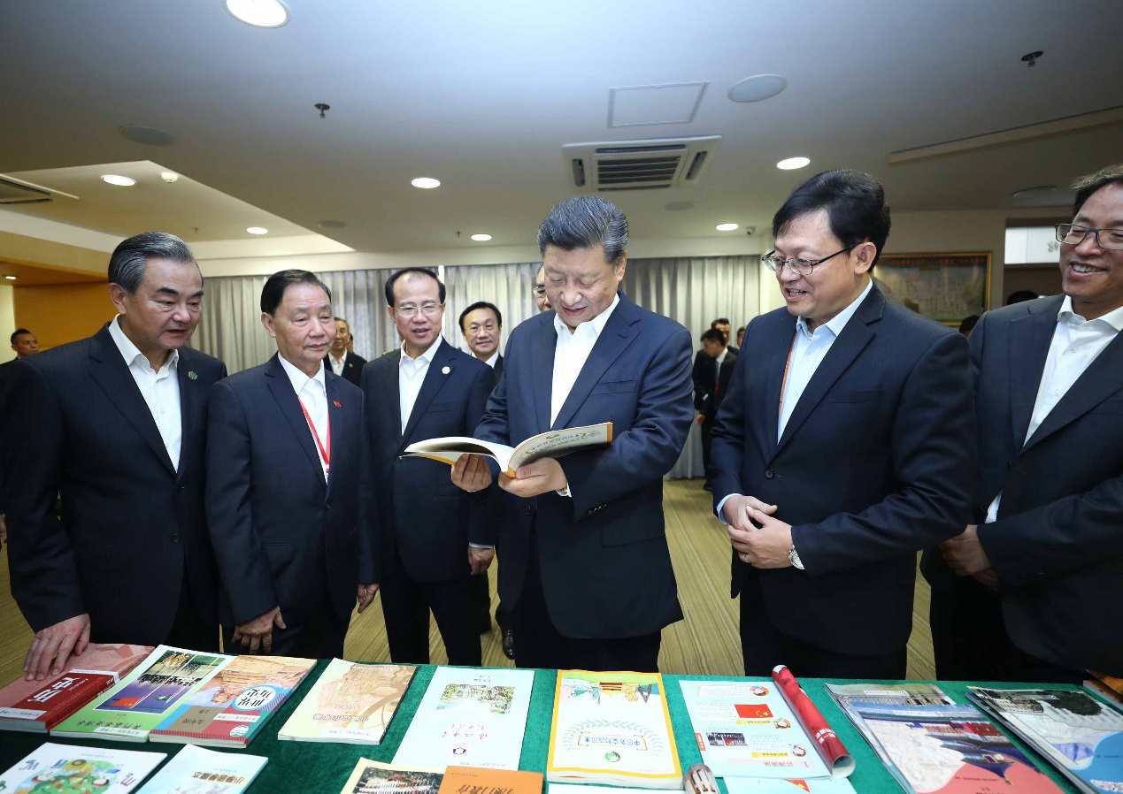 2019年12月19日,习近平在濠江中学附属英才学校图书馆仔细翻看展台上摆放的教材。