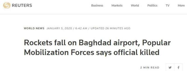 中新网1月3日消息,据俄罗斯卫星网报道,当地时间3日凌晨,三枚火箭弹落在伊拉克首都巴格达国际机场附近,爆炸造成至少8人死亡,12名伊拉克军人受伤。