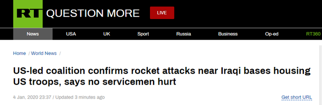 ↑“今日俄罗斯”(RT)消息,美国为首的的联军确认,4日有火箭弹袭击了位于巴格达和巴拉德的有美军驻扎的两个伊拉克军事基地附近,但炮击没有造成美国军事人员的伤亡。