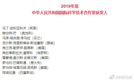 10名外籍科学家获得中华人民共和国国际科学技术合作奖。