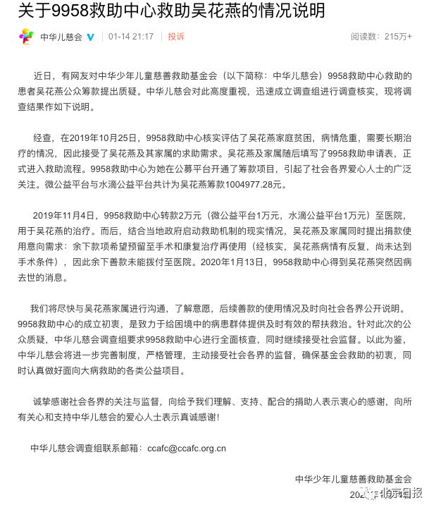 1月13日,吴花燕不幸去世,随后有媒体曝出中华儿慈会(全称为中华少年儿童慈善基金会)9958平台为吴花燕进行的募捐,在家属不知情的情况下,多募集了40万元,总额达到了百万,引发社会关注。