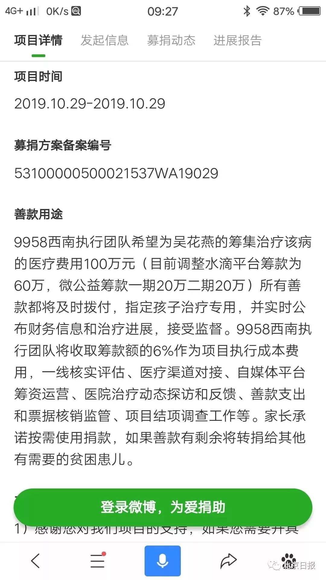 在9958儿童紧急救助中心为吴花燕筹款的项目信息里,这样写着——9958西南执行团队希望为吴花燕筹集治疗该病的医疗费用100万元,要收取6%作为执行成本。