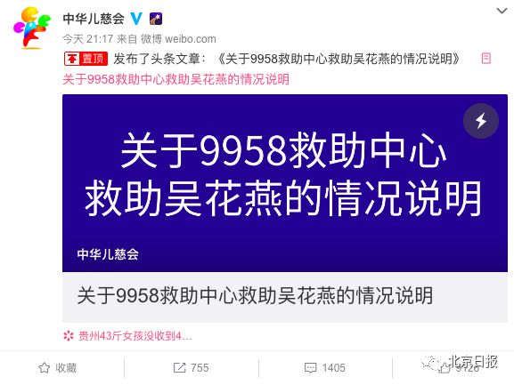 1月13日,贵州43斤女大学生吴花燕去世后,有媒体曝出中华儿慈会(全称为中华少年儿童慈善基金会)9958平台为吴花燕进行了募捐,在吴花燕不知情的情况下多募集40万元,总额达到100万元,迅速引发社会关注。