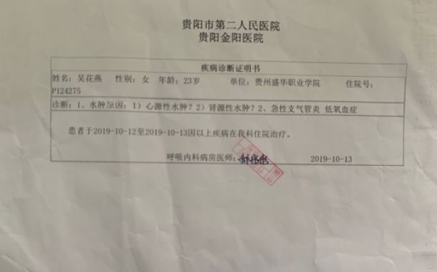 吴花燕就读的贵州盛华职业学院表示,从2017年9月入校到2019年12月,她共享受政府助学金20650元、学校助学金23000元、学校爱心教师资助17000元,共计60650元(住院前47500元,住院后13150元)。