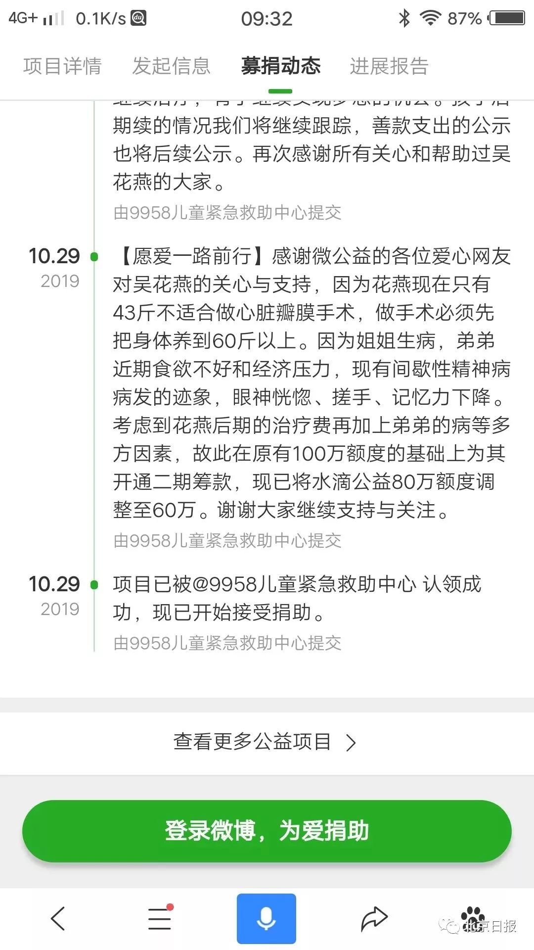 经查,在2019年10月25日,9958救助中心核实评估了吴花燕家庭贫困,病情危重,需要长期治疗的情况,因此接受了吴花燕及其家属的求助需求。吴花燕及家属随后填写了9958救助申请表,正式进入救助流程。9958救助中心为她在公募平台开通了筹款项目,引起了社会各界爱心人士的广泛关注。微公益平台与水滴公益平台共计为吴花燕筹款1004977.28元。