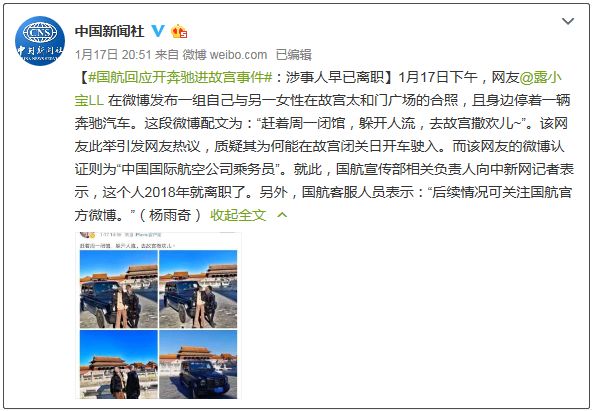 进故宫的是一位网友。17日下午14:56,她发了这样一条微博:“赶着周一闭馆,躲开人流,去故宫撒欢儿~”微博配图显示,一辆黑色奔驰车停在了广场前,而出镜的两位女士均着便服,没有佩戴任何故宫工作人员证件。