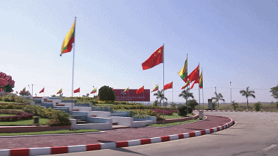 从机场前往市区途中,多处可见“中缅胞波友谊万古长青”等字样的横幅和巨型标语。