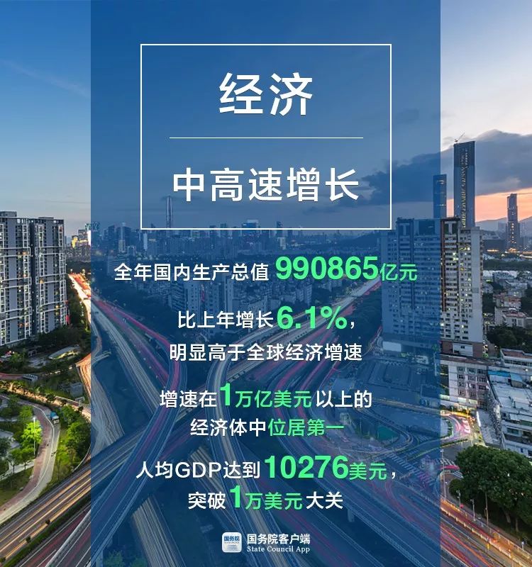 国家统计局1月17日上午公布2019年国民经济运行情况数据,初步核算,全年国内生产总值990865亿元,年末中国大陆总人口140005万人,人均国内生产总值10276美元,经济运行总体平稳,发展主要预期目标较好实现。2019中国经济有哪些特点?一起来看——