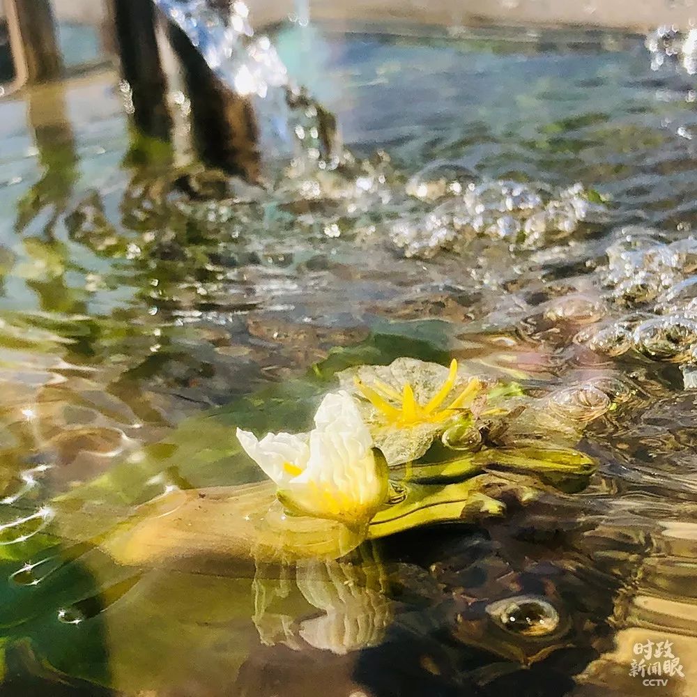 △考察现场摆放了模拟滇池生态的生态缸,一朵海菜花刚刚开放。随着生态环境改善,消失多年的海菜花等水生植物重现滇池。(总台央视记者彭汉明拍摄)