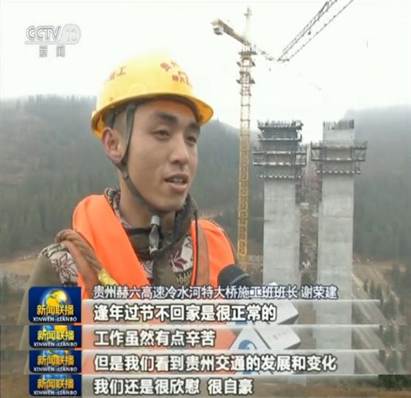 这个春节,正在建设的贵州赫六高速冷水河特大桥,200多名工人坚守施工一线。张绍勇和工友们正在安装桥墩钢筋。由于桥墩还未封顶,施工电梯只能够修到54米高,工人们要上到130米高的作业区,还要再爬七八十米的楼梯。每天的午饭和晚饭都是吊上去的。