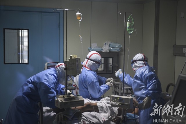 (2月3日15时50分许,娄底市中心医院,医护人员在隔离病房内对重症病人刘某举行抢救。当天下午,该院收治的一名61岁、确诊感染新型冠状病毒肺炎的重症病人刘某病情转危,医护人员立即展开救治工作。经过3个半小时的全力抢救,病人终于转危为安。)