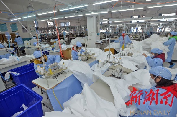 (2月3日,湘潭高新区湖南永霏特种防护用品有限公司,工人在加紧生产医用防护服。当天,该公司投产,成为我省首家医用防护服生产企业。目前,可日产防护服1500套。湖南日报·新湖南客户端记者 李健 通讯员 刘澜 摄影报道)