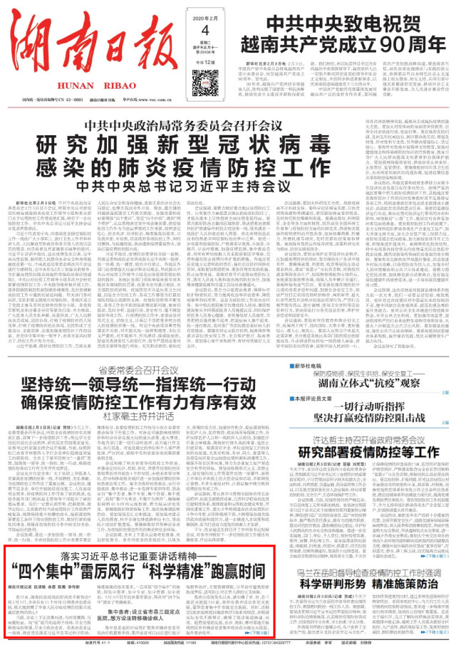 当前,全省上下正鼓勇而进,与时间赛跑、与病魔较量。战“疫”展开的是两个战场:尽全力阻断病毒的传播,尽全力救治患者。在救治患者这一战场,我省坚决落实习近平总书记科学防治、精准施策的根本要求,一直采取“四个集中”的原则,即集中患者、集中专家、集中资源、集中救治。2月3日召开的省委常委会,再次对“四个集中”提出了明确要求。