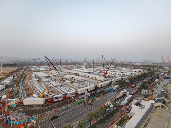 为按时完工,连日来,936名建设管理人员,7435名施工人员,1491台挖机、吊车等机械设备争分夺秒,奋战一线。目前,隔离病房区完成总体工作量的75%。其中,基础施工全部完成,箱板房完成吊装2000余间,地板胶施工完成1000间,卫生间贴砖完成200间,房间内安装及装修同步施工;医技楼钢结构安装完成90%;液氯加药间、垃圾处理站、液氧站、正负压站房、垃圾暂存间等设备基础完成,污水处理站安装完成。