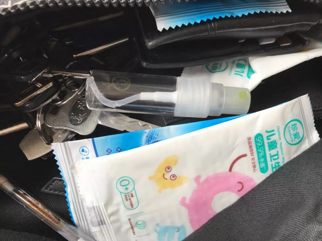 “老婆把我的这个小包包都装满了,又是酒精喷雾又是湿纸巾。这一切都是她满满的爱。”