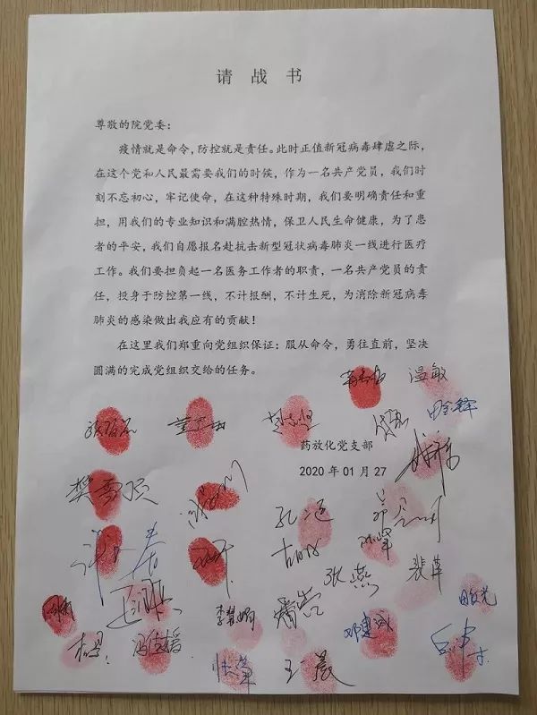 一张张按着红手印的请战书纷纷发到内蒙古一机医院先锋党员群,有的以个人名义请战,有的以支部名义请战。他们中,有曾支援过“非典”前线的党员,有90后的年轻人,更有还在哺乳期的妈妈、孕妇。截至当晚7点半,全院151名医务人员主动报名加入“医护救援队”。