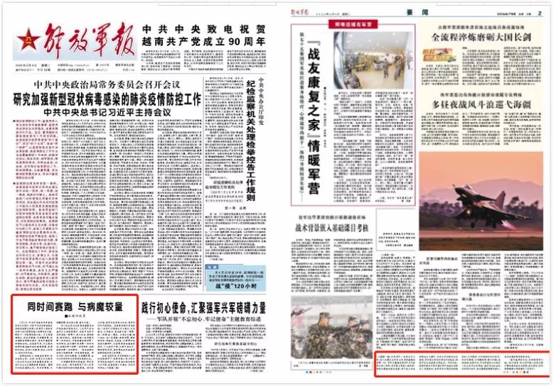 在人民生命安全和身体健康受到严重威胁的紧急关头,人民军队坚决落实习主席重要指示,在党中央和中央军委统一指挥下,闻令而动、勇挑重担、敢打硬仗。疫情防控工作部署在第一时间作出,应急救援机制在第一时间响应,各支援队伍在第一时间行动,各相关部门在第一时间协同,防疫物资在第一时间输送……阻击疫情的各项工作都在第一时间紧张推进。争分夺秒,同时间赛跑、与病魔较量,成为全军官兵的无声语言和果敢行动。