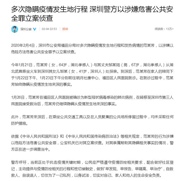 据@深圳公安 ,2020年2月4日,深圳市公安局福田分局对多次隐瞒疫情发生地行程和发热病情的范某芳,以涉嫌以危险方法危害公共安全罪予以立案侦查。