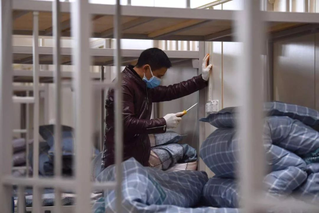 记者现场看到,武汉客厅A厅里,工人正在布置床位。一位环卫工人说,他们是一早被派到客厅,主要工作是铺设被褥。另外,武汉建工的施工工人也正在对电路、隔断等进行施工。还有城管执法队员也参与床位布置。