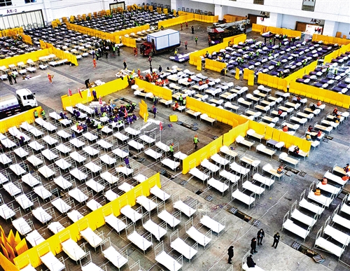2月4日下午,记者探访了洪山体育馆。众多工人正在热火朝天地进行施工,几百张简易病床已经整齐排列好。病床边都摆放了桌椅,方便放置药品等物资。在体育馆门口,数辆卡车满载物资,正等待驶入体育馆内。据悉,洪山体育馆将设立3个大型病区,都由室内篮球场等场馆改造而成。