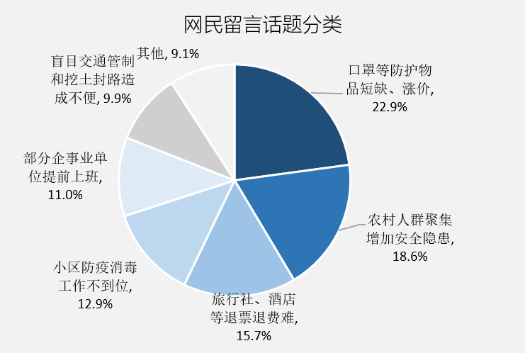 在《领导留言板》,网民最关注疫情防护用品的供应状况,担心物品供应不足与价格上涨,相关留言占比22.9%。网民希望相关部门做好市场监督管理工作,加大处罚力度;希望政府能统一调配和发放口罩,优先保证医护人员和户外工作人员的使用。一位内蒙古的网民称,在抗击疫情的紧要关头,一些村镇药店售卖口罩价格离谱,部分KN95口罩标价80元一个,恳请市场监督管理局加强处罚力度,严惩这种涨价行为。