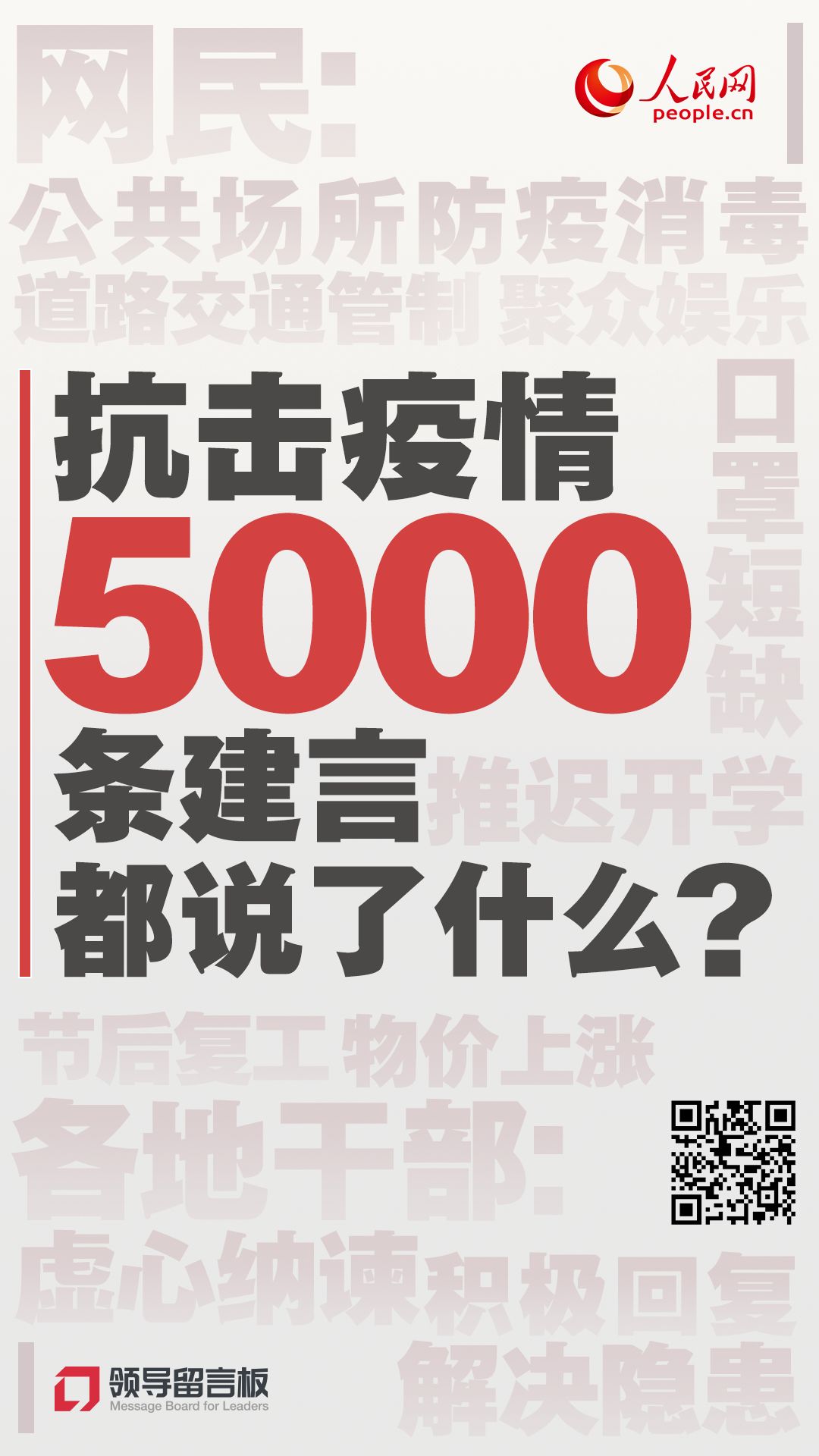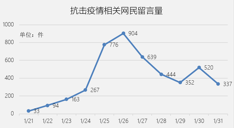 近期,“新型冠状病毒肺炎”疫情肆虐全国,疫情及防控工作引发民众高度关注。众多网民通过《领导留言板》为“抗疫”工作献言献策。在1月21日至31日这11天里,网民给各地领导干部的相关留言近5000件,内容主要集中在公共场所聚众娱乐、口罩短缺与物价上涨、推迟开学与节后复工、道路交通管制、公共场所防疫消毒等方面。各地领导干部高度重视网民的意见和建议,虚心纳谏,积极回复,解决了许多潜在隐患,一定程度上缓解了民众的焦虑情绪,提升了地方“抗疫”工作的实效。