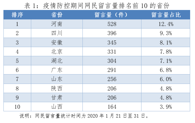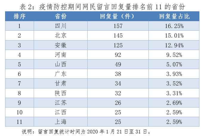 对于网民诉求,全国31个省份均做出了相关回应,累计答复网民留言近1000件。四川、北京、安徽的回复量依次排名前三。