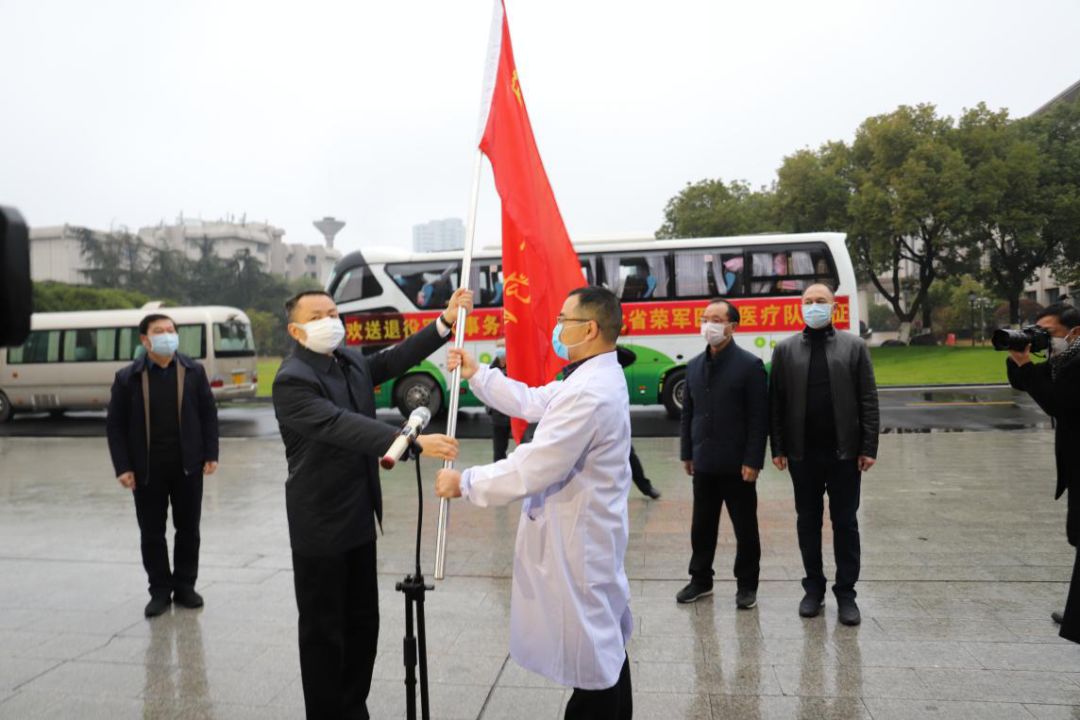 退役军人事务部拥军优抚司负责人代表部领导作出征动员,随后,他将一面鲜艳的红旗,郑重授予医疗队……