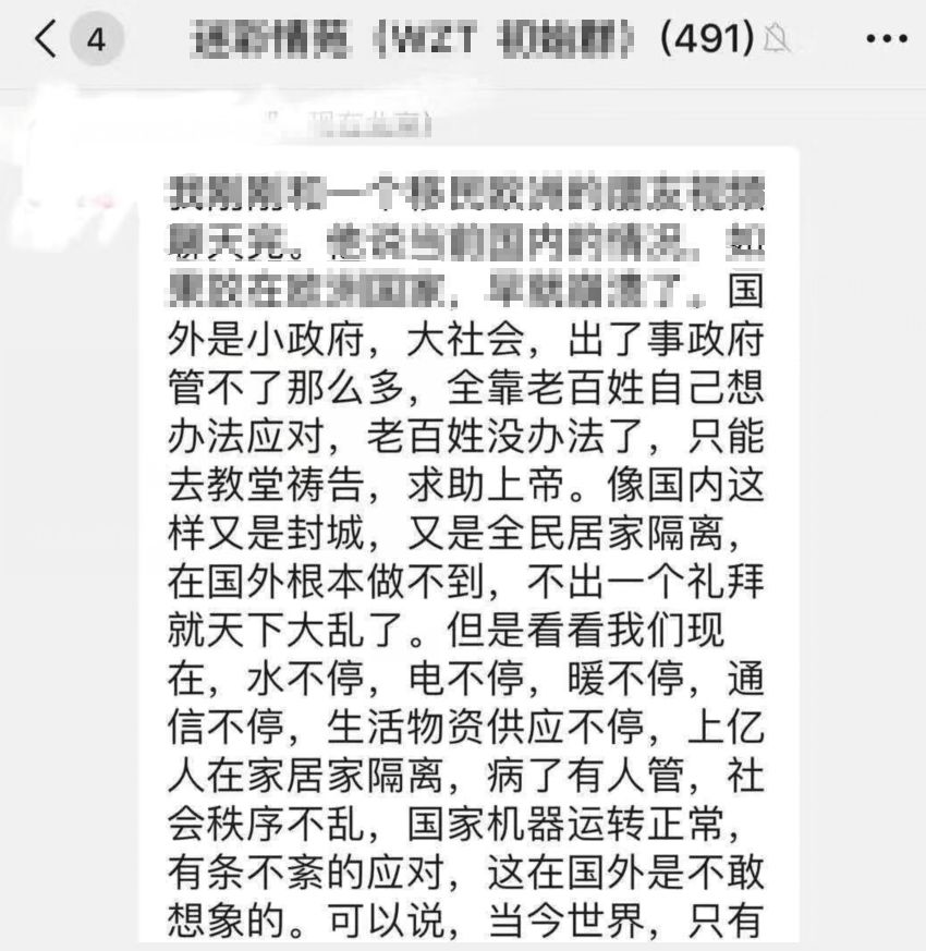 一位网民与欧洲华人朋友的微信聊天记录,日前在互联网广泛转发。聊天中,欧洲华侨感叹,“国外出了事政府管不了那么多。但看看我们现在,水不停,电不停,暖不停,通信不停,生活物资供应不停,社会秩序不乱,国家机器运转正常,有条不紊地应对,这在国外是不敢想象的。”