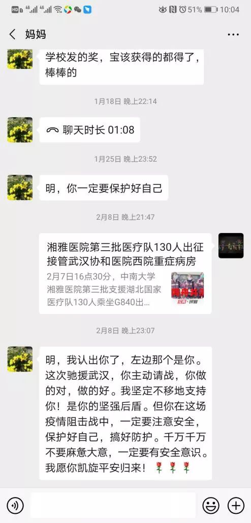 考虑父母年纪大了,不想让他们担心,所以来武汉一直没有告知。下午爸妈拨打我手机3次,没想好怎么回复,一直没敢接。第二天一早,爸爸发来微信:“爸妈知道了,注意保护自己,你是我们的骄傲,全家给你祈福,盼着你平安回家”。瞬间泪目......