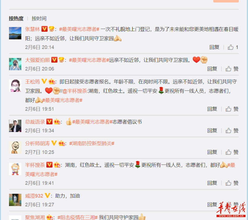 华声在线2月12日讯(记者 张圣曜 邓拓平)最近,一个由热心居民发布的“最美曙光志愿者”的微博话题,没想到一下子“火”了。数十条原创稿件,阅读量近200万,素材均来自长沙市岳麓区桔子洲街道曙光泊岸小区,讲述着疫情袭扰下的身边人身边事,记录着这一段守望相助、休戚与共的特别时光。