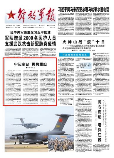 经习主席批准,人民军队增派2600名医护人员支援武汉抗击新冠肺炎疫情,首批力量1400人于2月13日抵达武汉,并计划在第一时间展开相关医疗救治工作。这一重大部署、强大支援,是人民军队听从统帅号令、践行初心使命的实际行动,也是子弟兵继续发扬我军勇挑重担、连续作战优良传统和作风,积极投身疫情防控斗争最前线的有力举措。