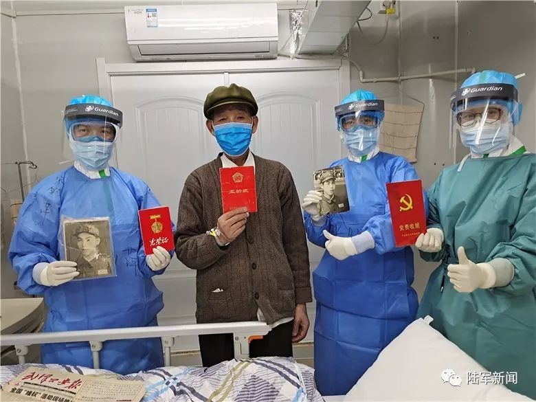 宋彩萍(左一)、张丽敏(右二)等医护人员与患者、一位退伍老兵交流,帮助患者增强战胜病毒信心。