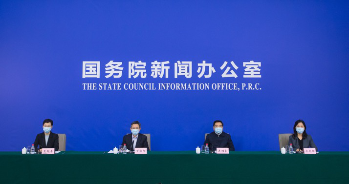 ↑三位中央指导组成员出席国新办发布会。新华社记者肖艺九摄
