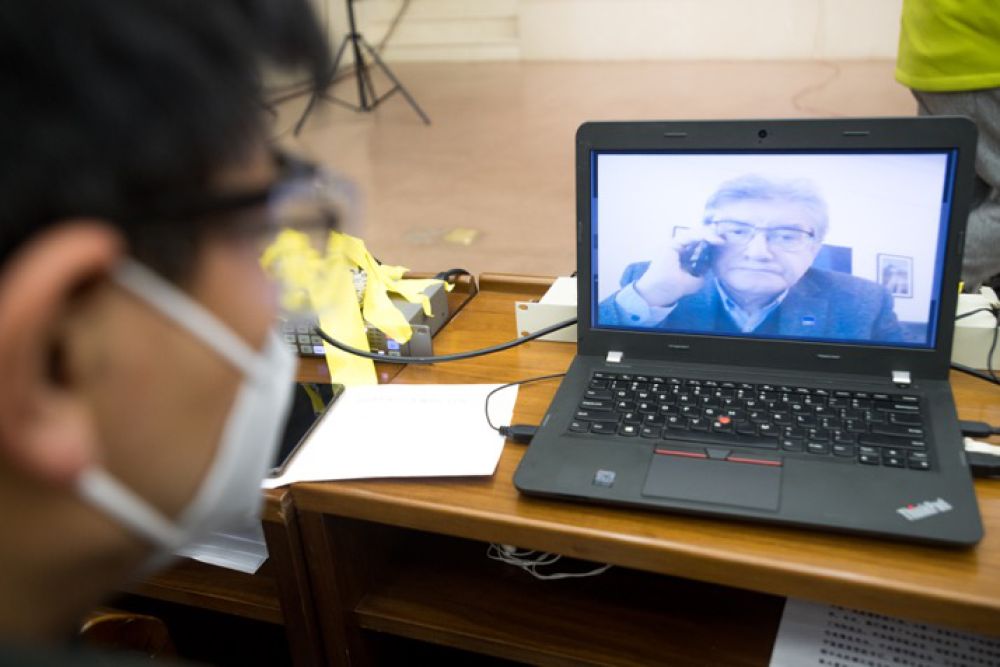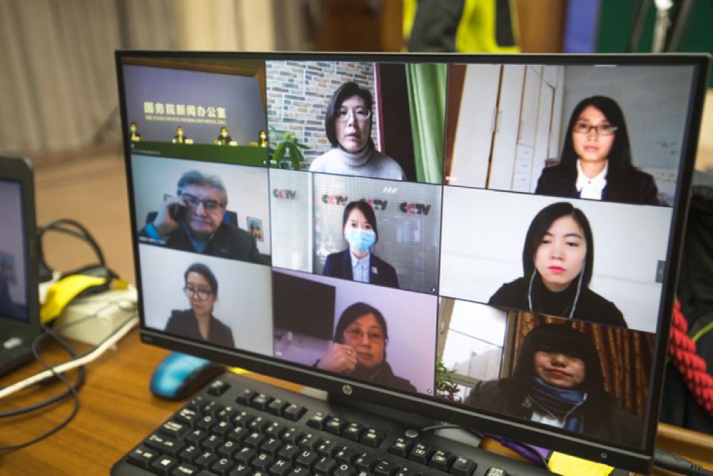 ↑记者通过视频连线提问。新华社记者肖艺九摄
