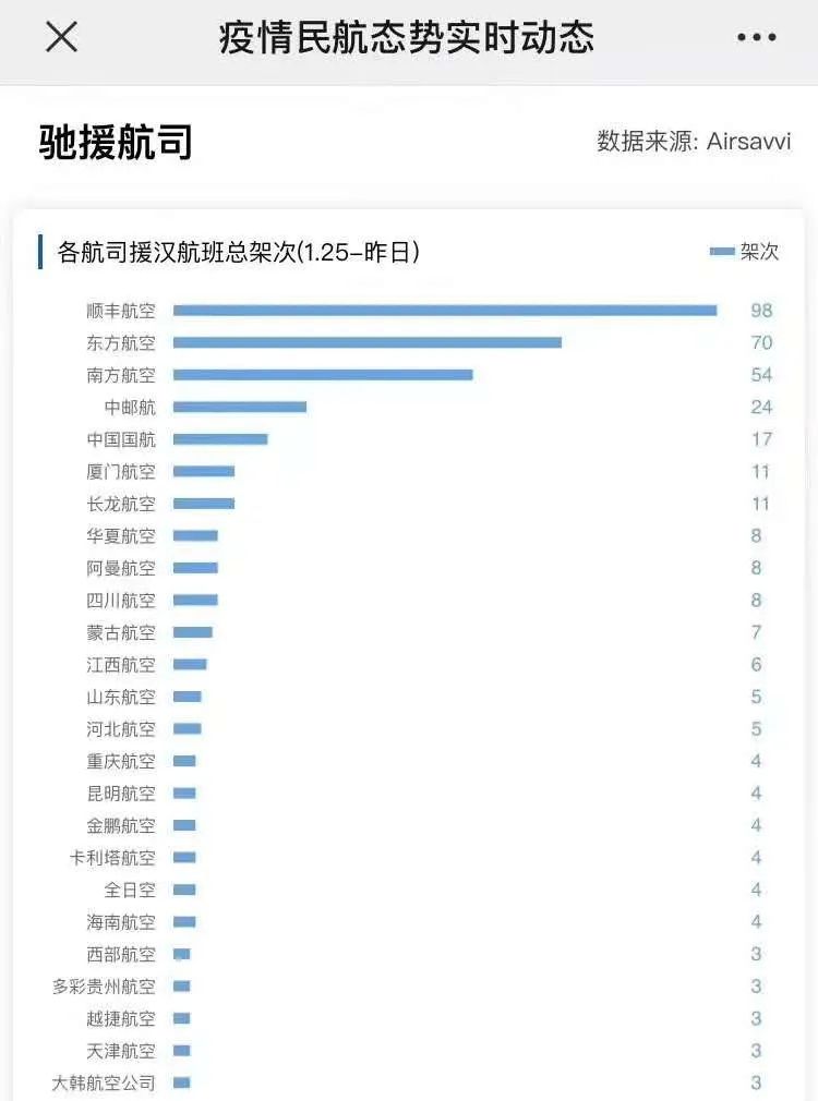 在“驰援航司”数据图上,疫情民航态势实时动态统计显示,顺丰航空、东方航空、南方航空、中国邮航位居前四强,这其中邮政快递系占据了两元,而且顺丰航空名列榜首。可见,在国家重大事件中,邮政行业正在以更加奋进、更加自信的姿态迎接挑战。