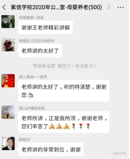 在沧州市,紫信家政培训学校建立了三个微信群:一群为育婴、养老护理,二群为家政技能、面点制作,三群是联合沧县妇联为当地农村妇女开设的学习群。一、二群已加满,培训学员达到1000人次。每晚八点,准时有专业教师以音频、视频、录屏授课等形式开展讲座。德雨家政培训学校联合沧县妇联,专门给3个乡镇妇女建立微信群,进行线上授课。