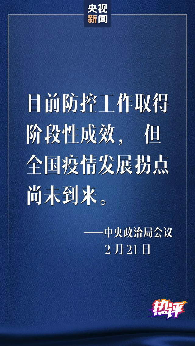这次政治局会议充分肯定了疫情防控工作取得的进展,同时也提醒大家,“全国疫情发展拐点尚未到来,湖北省和武汉市防控形势依然严峻复杂”。这是26天来在这几次重要会议中,第一次直接提到“拐点”。判断“拐点”是否到来,是件非常慎重的事情。我们能笃定认识到的是:每奋战一天,就离“拐点”又近了一天。
