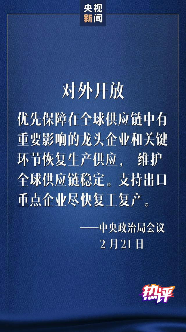 “优先保障在全球供应链中有重要影响的龙头企业和关键环节恢复生产供应,维护全球供应链稳定”——中国很多行业企业,已站在全球供应链的核心节点上。中国机器开动起来,全球供应链才稳。逐步复工复产之际,“优先保障”谁,此次会议给出了精准的指向。
